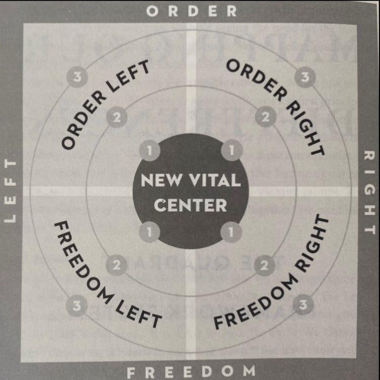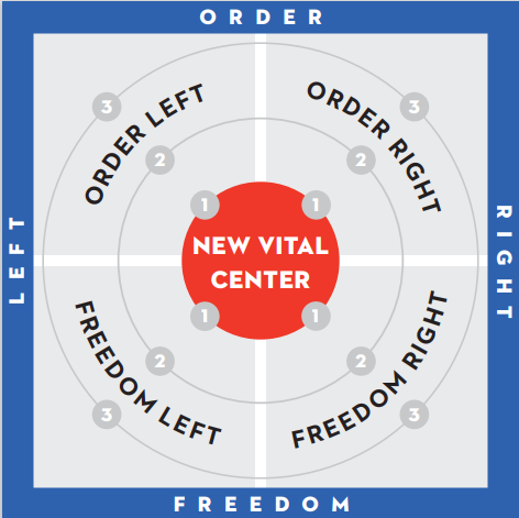 Look at the quadrant diagram below. Where all four quadrants come together (intersection of the order and freedom axes) was once our vital center. It was our grounding, our public philosophy, and the glue that held us together. We appealed to it when our country got off track or needed correction. When we finally decided to end the scourge of slavery, we went back to it. When after the Civil War, Reconstruction was highjacked and left incomplete, we returned to it, inspired to finish the task in the civil rights era.